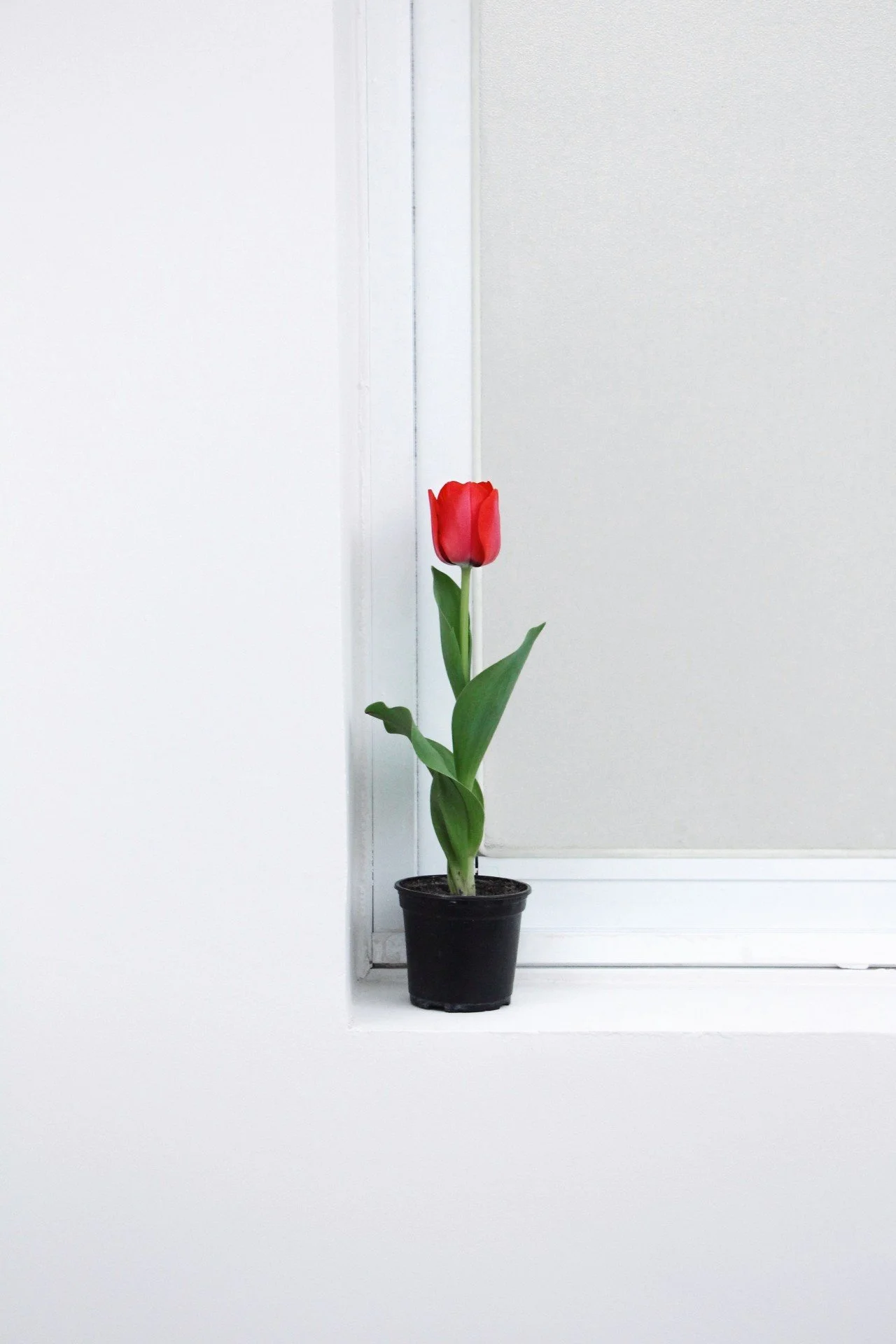E então, ele começou a desenhar uma flor vermelha com o caule verde."